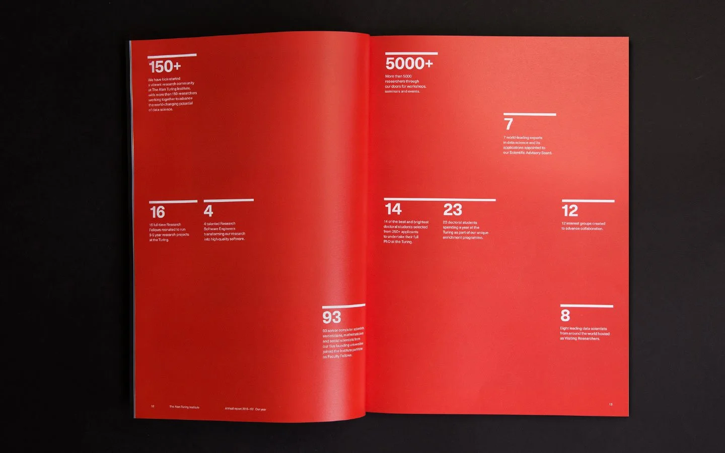 Alan Turing became synonymous with the contrary by looking at patterns in nature. Likewise, the Institute prides itself on its combination of academic gravitas with innovative practices. We wanted to translate this blend of rigidity and flexibility in thinking to the new design, with a first layer of precise and ordered information that gives way to exciting, undefined and colourful imagery behind, to convey the robust yet visionary work being completed.